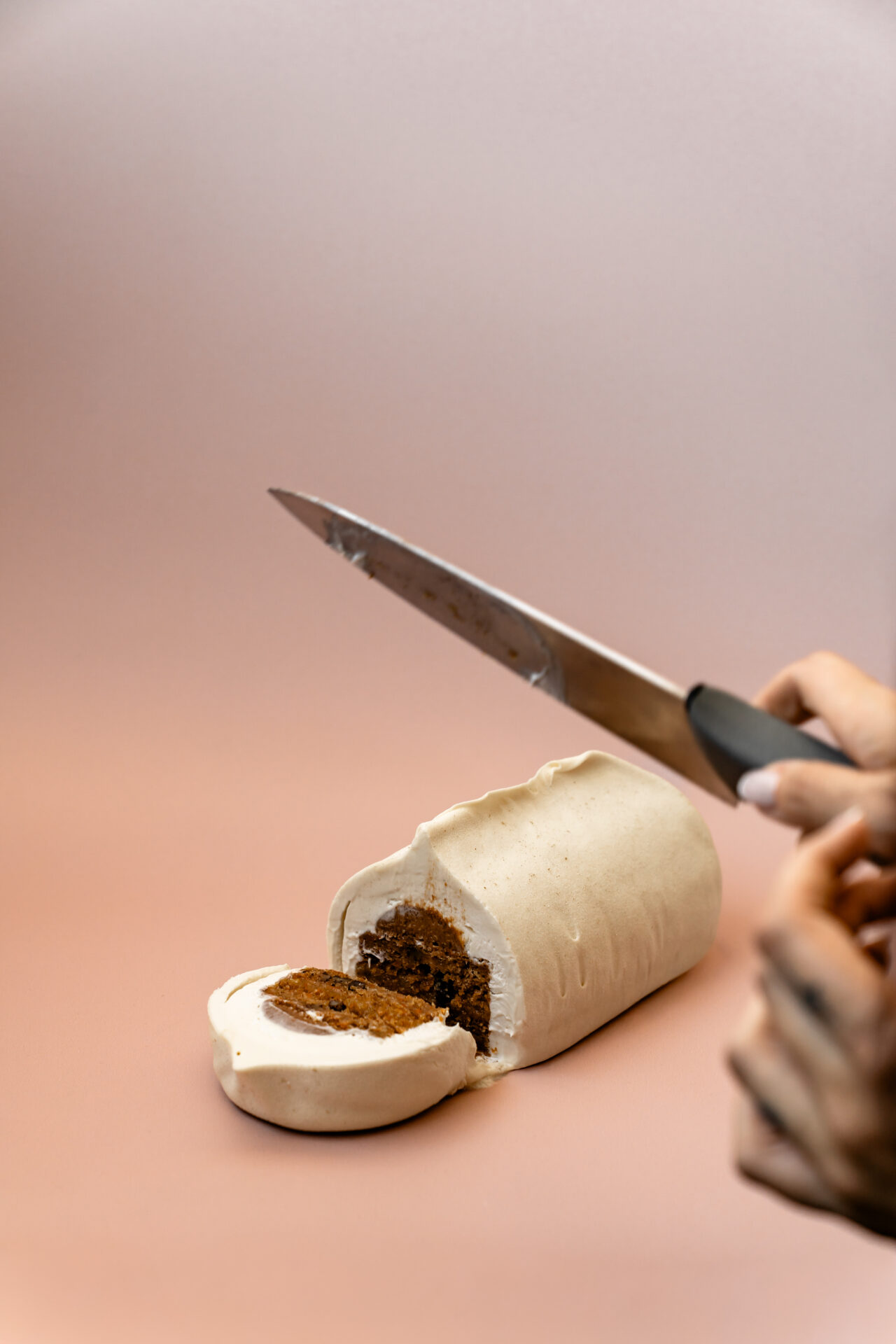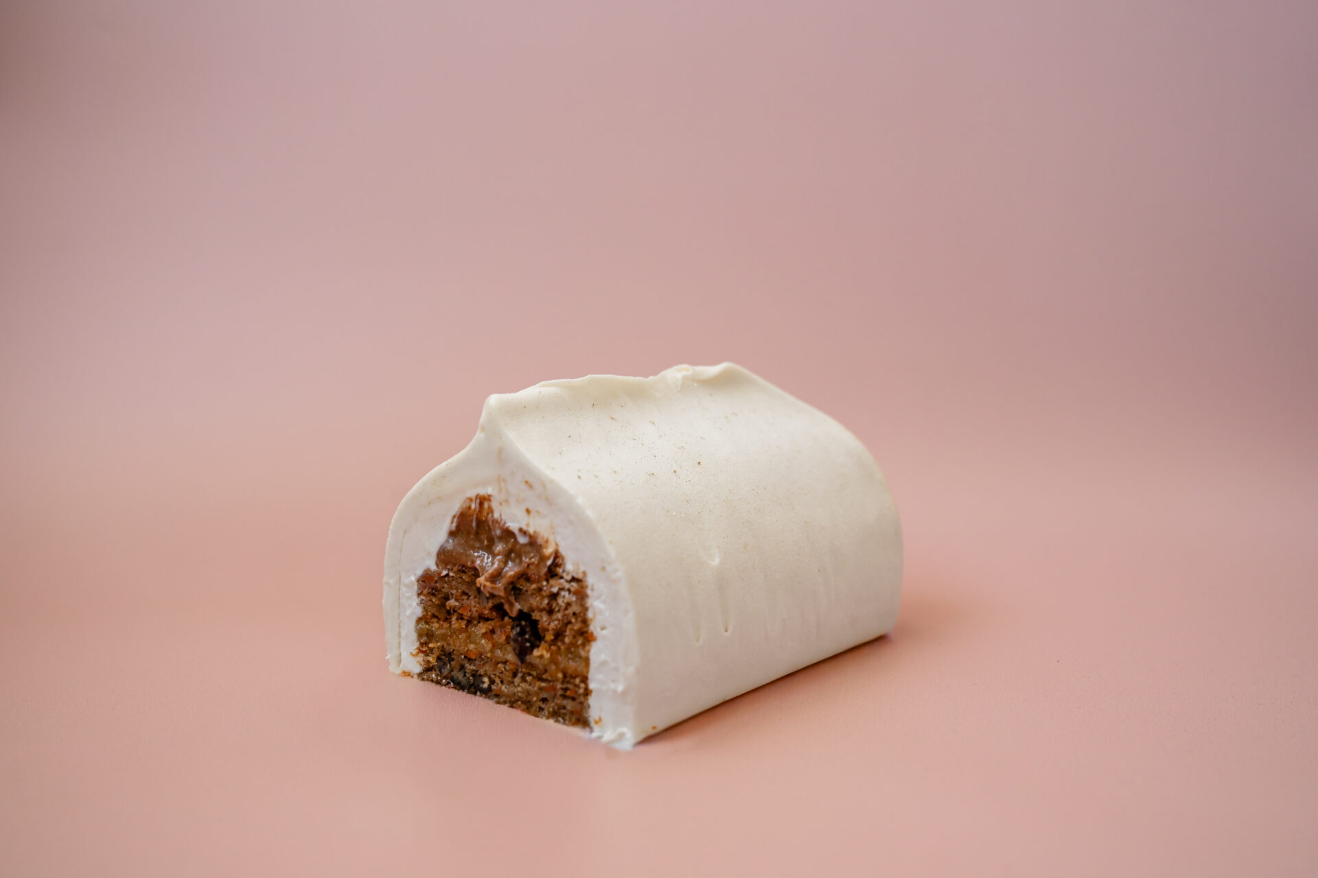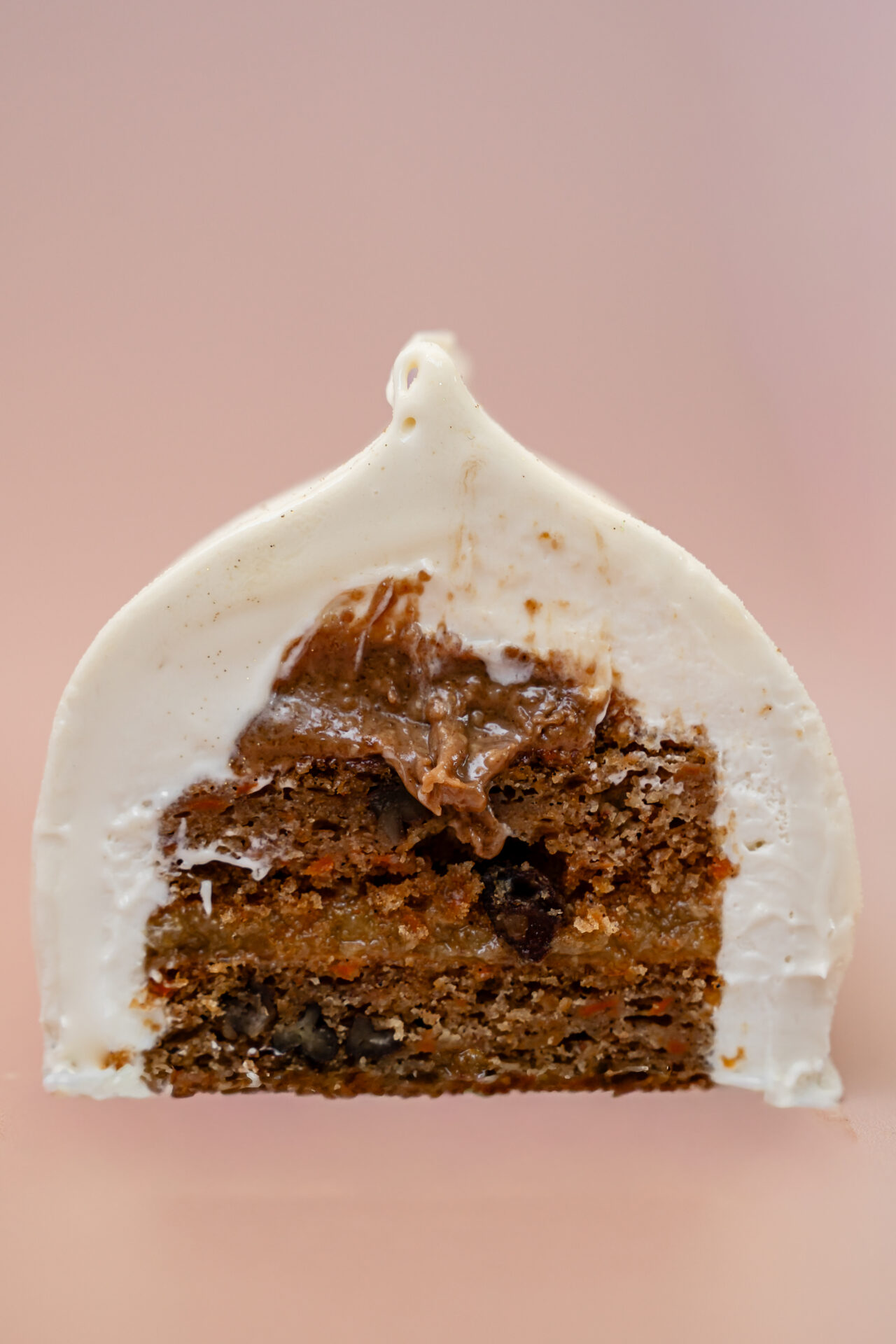 Biscuit moelleux carrot cake aux épices, confit d’agrume, mousse creamcheese enrobée de ganache montée vanillée et coeur coulant de praliné pécan.