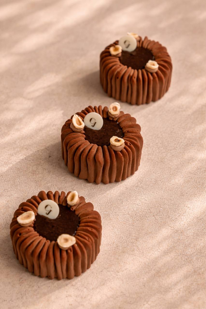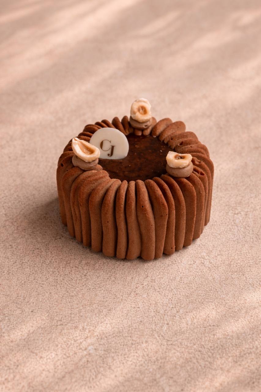 Croustillant praliné, biscuit financier, crémeux et mousse chocolat 53% infusé au café, coeur coulant praliné noisette café
