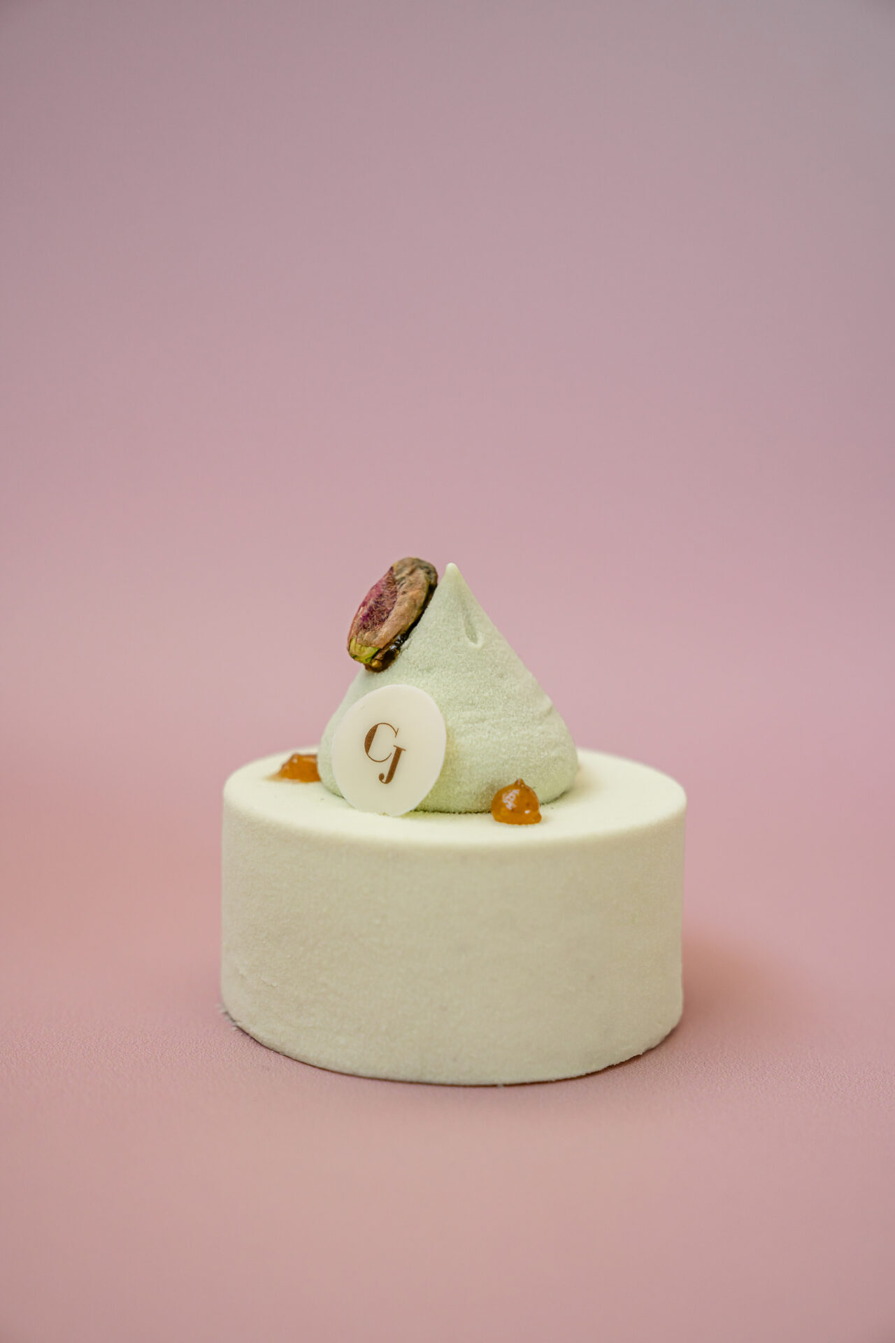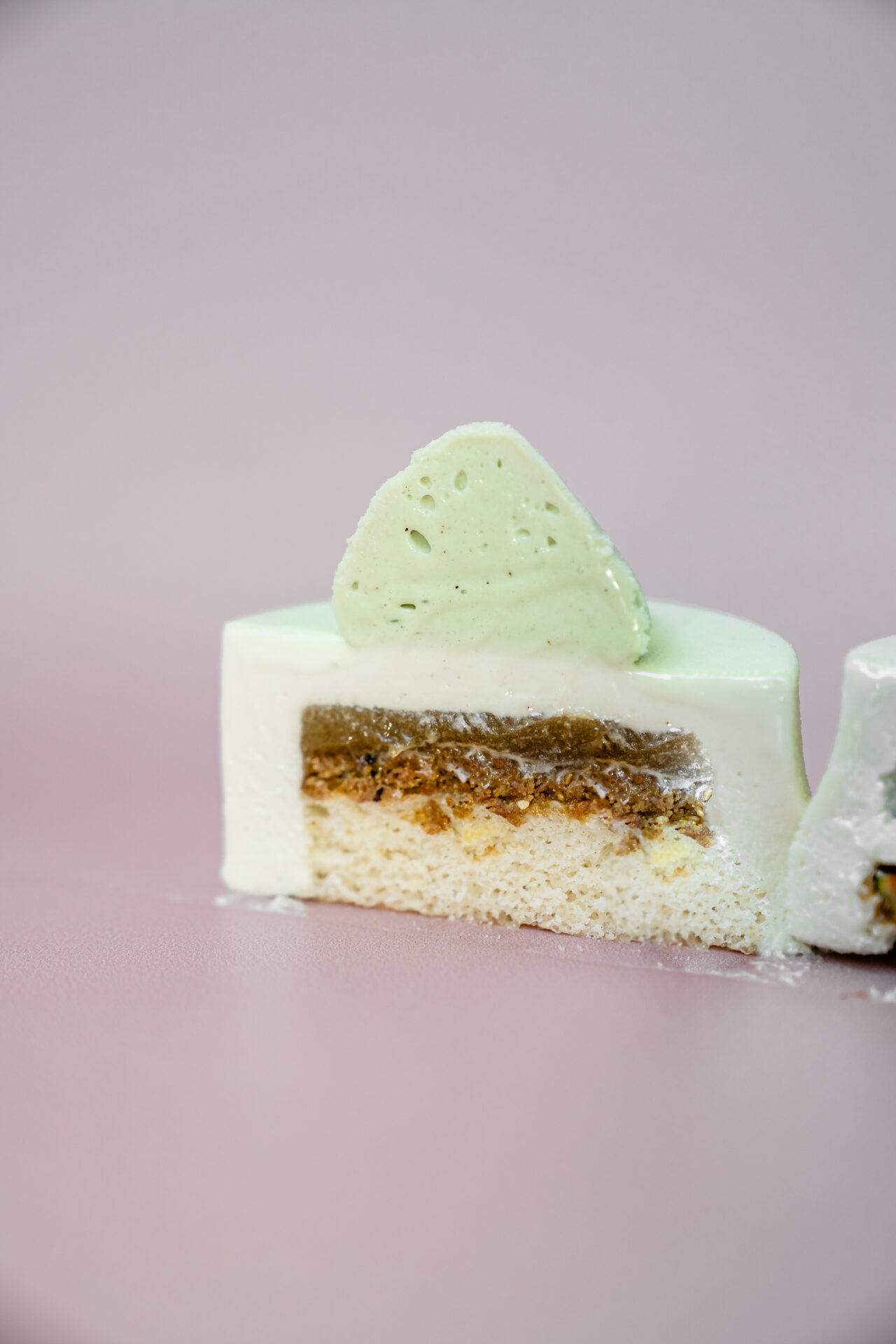 Croustillant praliné pistache fleur de sel, cake moelleux aux zestes de citron, coeur acidulé citron vert, mousse pistache et fleur d’oranger du liban et ganache montée pistache