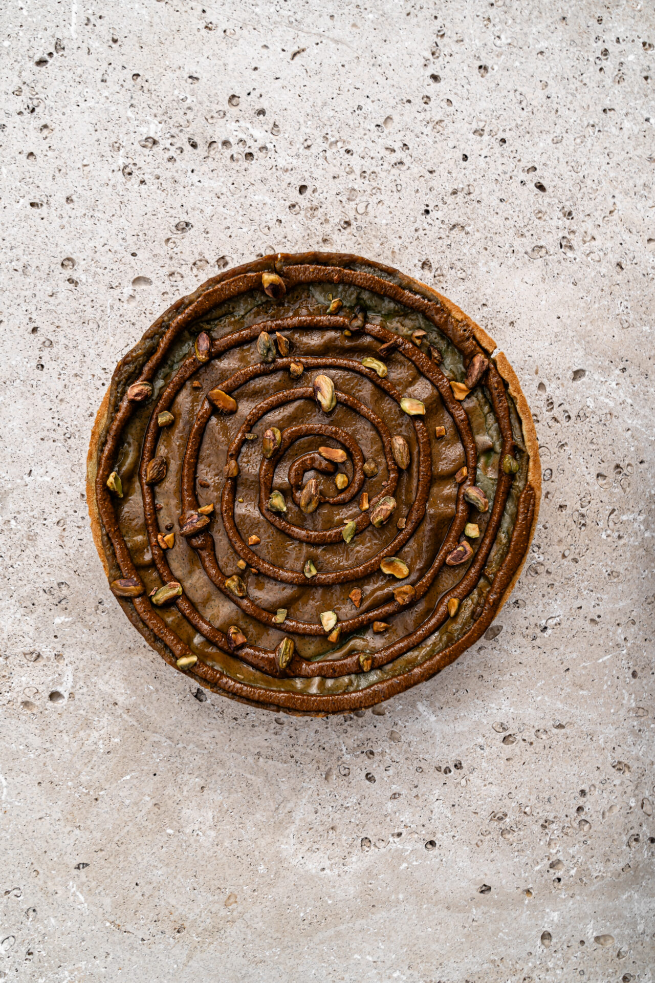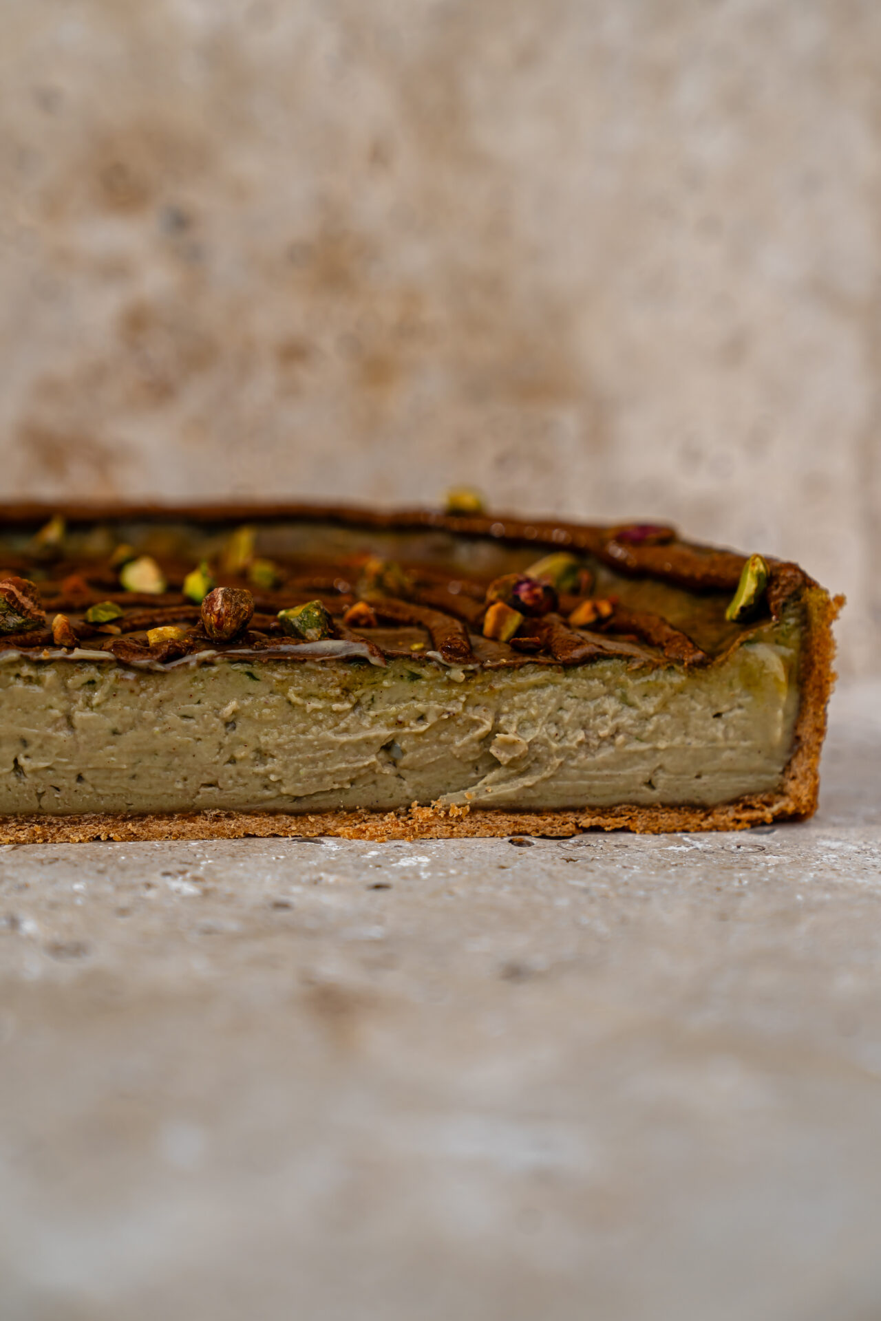 Une part de flan généreusement réalisé avec des éclats de pistaches d’Iran, du praliné pur pistache à la fleur de sel et une pointe de fleur d’oranger.