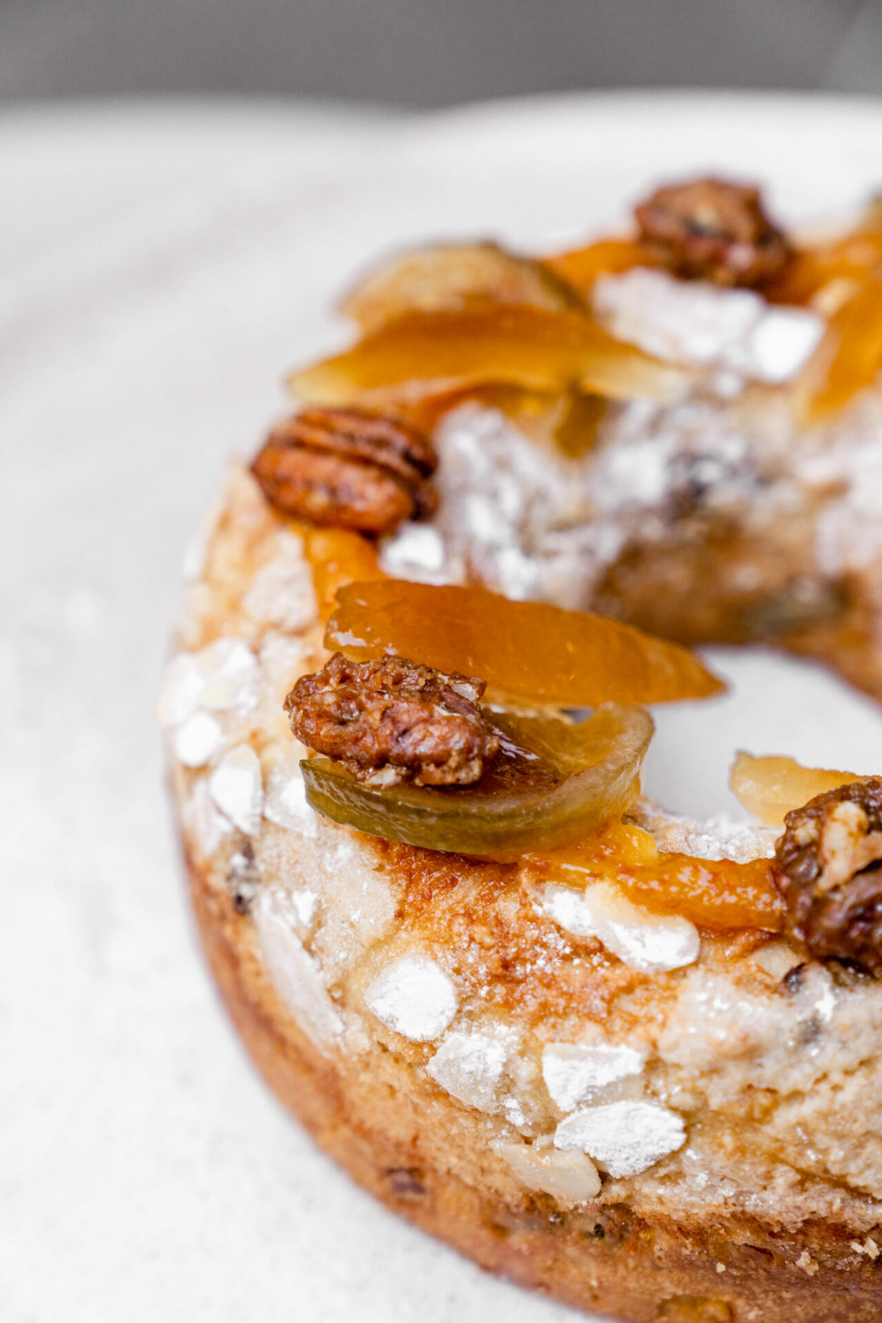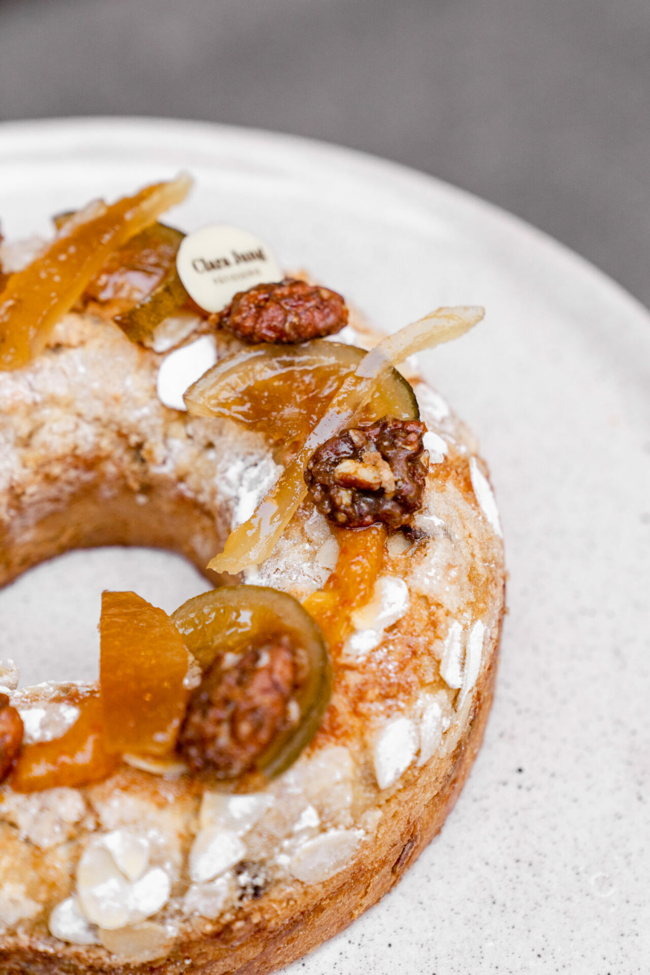 Brioche moelleuse à la mandarine et noix de pécan, fruits confits de Sicile, cœur coulant de confit de mandarine.